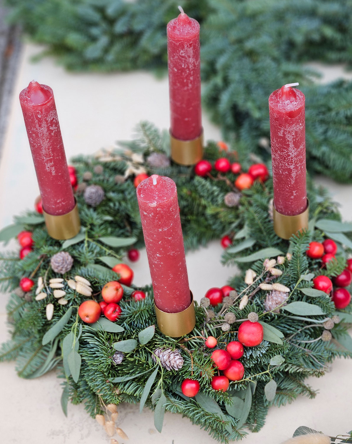Du kannst in weihnachtlicher Stimmung, deinen eigenen Adventskranz gestalten.